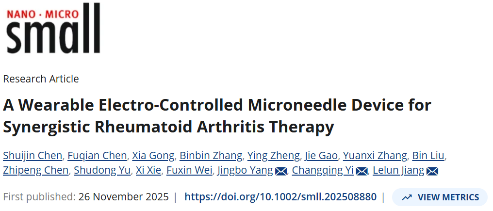 中山大学杨静波博士、蒋乐伦教授及易长青教授团队研发了一种可穿戴的电控微针装置EMND,用于类风湿关节炎(RA)的协同治疗。该装置通过微针阵列穿透皮肤,结合电控药物释放技术,实现了对药物的精准时空控制,能够同时递送抗炎药物和镇痛药物,显著降低了炎症因子水平并提高了疼痛阈值。研究结果表明,EMND在RA治疗中具有良好的应用前景,并可能扩展到其他慢性疾病的治疗。该研究成果以“A Wearable Electro-Controlled Microneedle Device for Synergistic Rheumatoid Arthritis Therapy”为题,发表在《Small》期刊上。