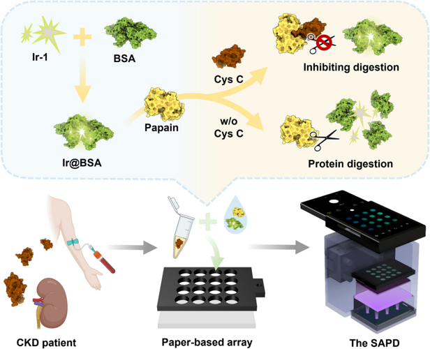 Abstract. The development of affordable and user-friendly diagnostic tools for early warning and monitoring progression of chronic kidney disease (CKD) is crucial to reducing CKD-related morbidity and mortality. This study reports on (1) a protein-templated AIEgen, Ir@BSA, which emits intense green phosphorescence with a quantum yield up to 69.40% and a lifetime up to 1839.40 ns in aqueous solution; (2) a straightforward protocol for Cys C quantitation, which employs Ir@BSA as the phosphorescent signal indicator and papain as the biomolecular recognition element, respectively; and (3) a smartphone-based portable phosphorescence reader (termed as SAPD), which can stably excite and accurately collect phosphorescence signals from the paper-based arrays. Quantitation of Cys C in clinical serum samples using SAPD integrated with the paper-based arrays highlights its remarkable advantages including high sensitivity (0.36 µg mL−1) and specificity, cost-effectiveness (∼$67.5 per set), portability (∼450 g), good precision (RSD ≤ 8.25 %), good accuracy (comparable to clinical standard latex immune-turbidimetric method), and high throughput (16 samples per experiment). More importantly, this study reveals the significant potential of Cys C as an early warning marker of CKD progression. The reported method enables Cys C quantitation anywhere, anytime, by anyone, and is ideally suited for mass screening for CKD and home monitoring of CKD progression, facilitating early diagnosis and proactive management of CKD.
