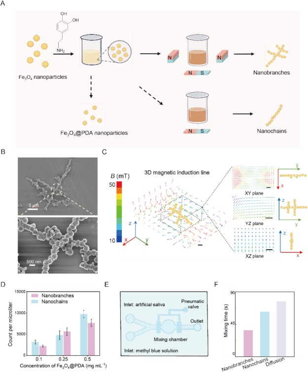 Abstract. Microfluidics is a powerful tool to integrate biological detection/chemical synthesis processes into a centimeter-size chip with microscale channels for fast and sample-saving detections and reactions. While offering advantages, the microscale channels make it difficult to mix high-viscosity liquid samples and reagents, hindering the further improvement of the rapidity, reliability, sensitivity, and accuracy of biological detections based on microfluidics. The nanorotors can be vital for mixing enhancement in microfluidic chips and specific binding as biomacromolecule carriers. However, the development of low-cost, mass-producible, and particular-shaped nanorotor fabrication methods has been desired but difficult. Here, we introduce low-cost multifunctional and structural magnetic nanobranches to improve mixing efficiency inside microfluidic chips and serve as biomolecular carriers. The nanobranches were fabricated by associating magnetic-field-induced Fe3O4 nanoparticle alignment with self-polymerized dopamine. The nanobranches combine the functionalities of mixers and antibody carriers, being mass-producible, biocompatible, and recyclable. The required mixing time by nanobranches can be as half as that by nanochains, and the reaction for Enzyme-Linked Immunosorbent Assay (ELISA) can be enhanced, promoting sensitivity improvement (∼1.8 times higher than that of nanochains), the limit of detection reduction (6.20, 13.7, 203, and 61.2 pg mL−1 for nanobranches, nanochains, nanospheres, and commercial ELISA kit, respectively), and linear range expansion. It is promising that the fabricated magnetic nanobranches would be a multifunctional tool for high-sensitivity biosensing.