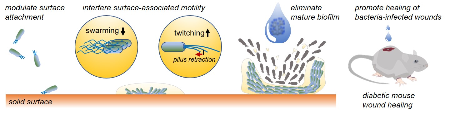 针对由细菌生物膜引发的感染及传统抗生素的耐药性问题,开发普适性抗菌药物递送系统或平台;开发不依赖于抗生素、具有生物膜防控特性的合成或天然高分子材料、功能有机/无机复合材料、以及能够阻止细菌生物膜形成的表界面工程化材料。