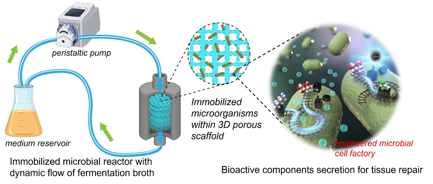 利用合成生物学技术平台,构建工程化微生物细胞工厂;借助于生物3D打印技术,构建发酵液可以动态流动的固定化微生物反应器,实现生物活性分子的高效、连续及可循环式制造;结合水凝胶制备技术,开发用于组织修复的生物活性材料。