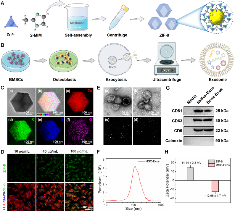 骨组织修复面临重大挑战,尤其是临界尺寸骨缺损的再生受限和免疫微环境失衡问题。传统自体骨移植存在供体有限和二次创伤等缺点,而人工骨材料则在免疫相容性和功能协同性方面仍有不足。MSC-Exos虽具有优异的成骨诱导潜力,但其免疫调节功能在成骨分化过程中显著下降。金属有机框架材料(MOFs)如沸石咪唑酯骨架-8(ZIF-8)在骨组织工程中展现出了独特的免疫调节特性,但其中的分子机制尚不明确。